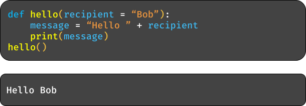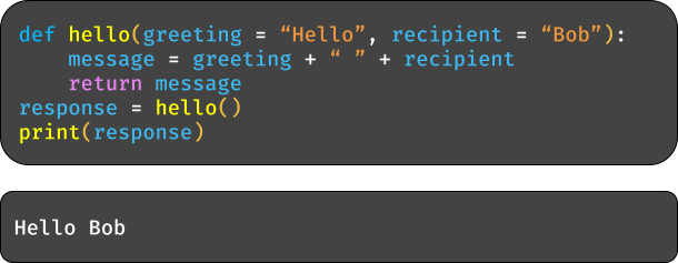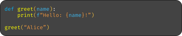 - Example: ‘greet(“Alice”)’ should print ‘Hello, Alice!’