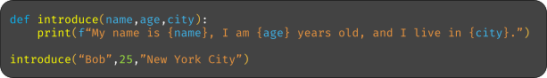 - Example: ‘introduce(“Bob”,25,“New York City”)’ should return ‘My name is Bob, I am 25 Years old, and I live in New York City’