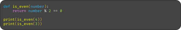 - Define a function ‘is_even’ that takes one parameter ‘number’ and returns ‘True’ if the number is even and ‘False’ otherwise.