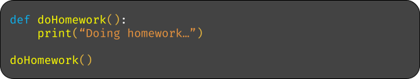 - Define a function ‘doHomework’ that prints “Doing homework”.