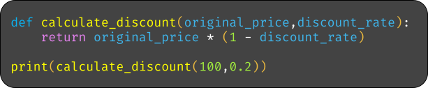 - Example: ‘calculate_discount(100,0.2)’ should return ‘80’