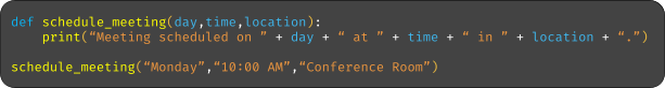 - Example: ‘schedule_meeting(“Monday”,“10:00 AM”,“Conference Room”)’ should print ‘Meeting scheduled on MOnday at 10:00 AM in Conference Room’
