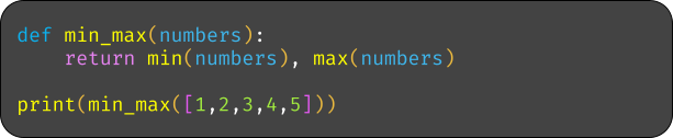 - Define a function ‘min_max’ that takes a list of numbers and returns the minimum and maximum values.