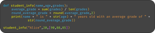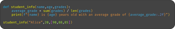 - Example: ‘student_info(“Alice”,20,[90,85,88])’ should print ‘Alice is 20 years old with an average grade of 87.67’