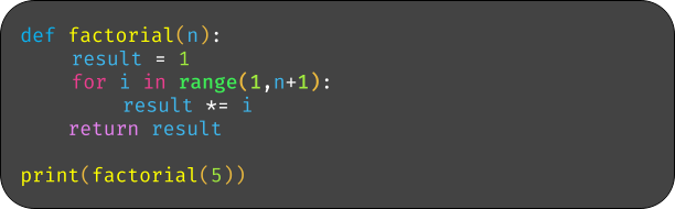 - Define a function ‘factorial’ that takes one parameter ‘n’ and returns the factorial of that number (which is the operation of multiplying together every positive number less than the number n).