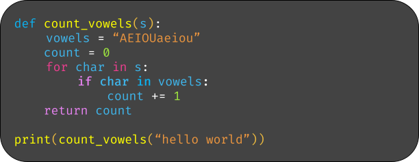 - Example: ‘count_vowels(“hello world”)’ should return ‘3’