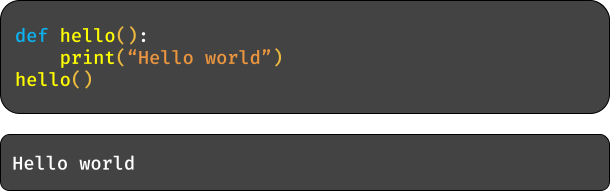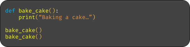 - Example: ‘bake_cake()’ should print ‘Baking a cake’