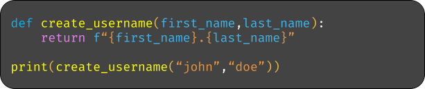 - Example: ‘create_username(“john”,“doe”)’ should return ‘john.doe’