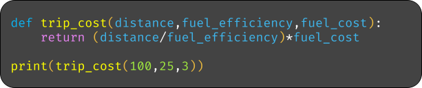- Example: ‘trip_cost(100,25,3)’ should return ‘12’
