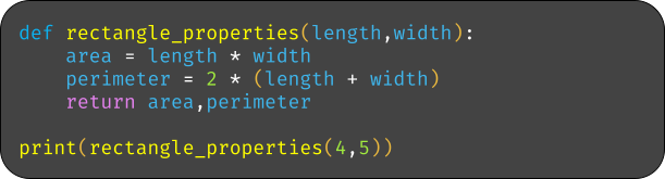 - Example: ‘rectangle_properties(4,5)’ should return ‘(20,18)’