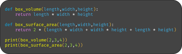 - Example: ‘box_volume(2,3,4)’ should return ‘24’