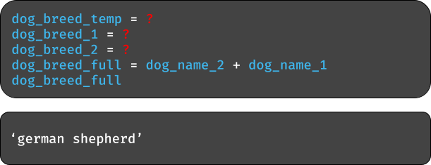 You might find that you want to swap the information stored between two variables. The code below will do just that, but it is incomplete. How can you fill it in such that when adding the two variables you get the output below? Hint: dog_breed_temp is a variable temporarily storing the information in one of the dog breed variables to be later stored in the other dog breed variable.