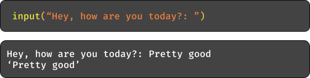 A more interesting method is one that has the computer ask you to give it information. input allows you to provide it with a question that the computer can ask, and whatever you type is what the computer will say back.